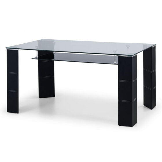 Elevate your dining experience with the Grace Clear Glass Dining Table with Black Faux Leather Legs by Furniture in Fashion. This exquisite dining table is designed to be the centrepiece of your dining area, combining modern aesthetics with functional elegance. The clear glass table top offers a sleek and spacious surface, perfect for hosting dinner parties or enjoying family meals. Its transparency adds a touch of sophistication and creates an open, airy feel in your dining space. The Grace Dining Table is built with high-quality materials to ensure durability and style. The black faux leather-wrapped legs provide a striking contrast to the clear glass, enhancing the table’s contemporary design. These sturdy legs not only offer excellent support but also add a luxurious touch to the overall look. Whether you have a modern, minimalist, or eclectic interior, this dining table seamlessly fits into various decors, making it a versatile and stylish addition to your home. FEATURES : Material : Covered Steel Framework Finish : Chrome Plating Modern Design : Sleek clear glass table top that enhances the visual appeal of your dining area Elegant Legs : Black faux leather-wrapped legs for a striking and luxurious contrast Durable Construction : High-quality materials ensure longevity and sturdy support Versatile Style : Complements a variety of interior decors, from modern to eclectic Spacious Surface : Ample space for dining, making it ideal for hosting gatherings and family meals A useful black glass under shelf is provided, allowing extra storage The Grace dining table will comfortably seat 6 people, creating a modern setting for your guests 10mm Clear Tempered Glass Top Shelf Dimensions – 104. 5cm L x 53cm W x 10mm D Distance Between Shelf and Table Top – 12cm Available at an affordable price Images shown are for illustration purpose only DIMENSIONS : Height : 75cm Depth : 150cm Width : 90cm