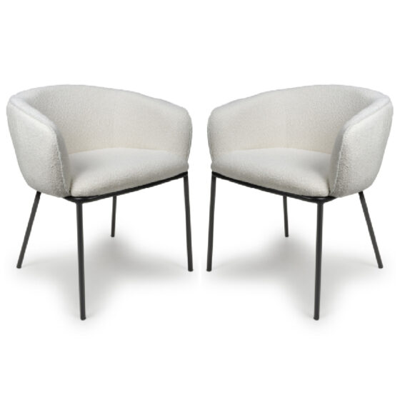 Elevate your dining experience with the Furniture in Fashion Langley White Fabric Dining Chairs. These chairs feature a sleek White fabric that adds a contemporary touch to your dining area, while the black legs provide a bold contrast, enhancing the overall modern aesthetic. Designed to blend seamlessly with various interior styles, these chairs offer both functionality and sophistication. Crafted with attention to detail, the Langley Dining Chairs are perfect for both formal dining settings and casual meals. The plush White fabric ensures comfort, while the sturdy black legs offer lasting durability. Transform your dining space with the perfect combination of style and practicality from Furniture in Fashion. Enhance your dining space with the Furniture in Fashion Langley White Fabric Dining Chairs, where modern design meets exceptional comfort and durability. FEATURES : Material : Fabric Finish : Plain Cappuccino And Black A fashionable curvy modern dining chair, upholstered in luxurious White boucle fabric The generous bucket seat is supported by high attractively curved armrests This versatile chair sits on a stylish rounded black metal frame, supported by splayed legs Sturdy black legs provide a striking contrast and enhance the chairs modern design Generously padded for a comfortable dining experience, whether for meals or gatherings Complements a range of decor styles, making it a versatile choice for any dining room The fabric is simple to clean, maintaining its fresh and stylish look Assembly required Available at an affordable price Images shown are for illustration purpose only DIMENSIONS : Height : 74cm Width : 59cm Depth : 62cm