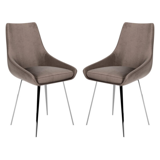 Add a luxurious statement to your dining area with the Furniture in Fashion Levant Mink Velvet Dining Chairs. Featuring plush velvet upholstery in an elegant Mink tone, these chairs bring sophistication and style to any modern or contemporary dining room. The rich colour palette and elegant silhouette make them a stunning focal point for your dining setup. Built for both comfort and durability, the Levant chairs include gently curved backs and cushioned seats for an enhanced dining experience. Supported by sleek chrome metal legs, these chairs offer long-lasting stability while maintaining a refined and minimalist look. Sold in a convenient set of two, theyre perfect for updating your dining space with a touch of glamour and comfort. FEATURES : Material : Velvet, Metal Finish : Mink, Chrome The Levant Dining Chair is a perfect blend of comfort and style for your dining space With a contoured backrest and a bounce-back cushioned seat pad, this chair provides a comfortable and sublime dining experience Crafted with soft touch velvet fabric and polished Stainless Steel legs Sumptuous Velvet, Contoured Back Rest Dense Bounce Back Cushioned Seat Pad Sublime Design, Polished Chrome Legs, Simple Assembly Upholstered in rich Mink velvet for a chic and luxurious aesthetic Padded seat and curved backrest provide superior comfort and support Crafted by Furniture in Fashion, a trusted UK brand known for quality and styles Available at an affordable price Images shown are for illustration purpose only DIMENSIONS : Height: 90cm Width: 52m Depth: 63cm