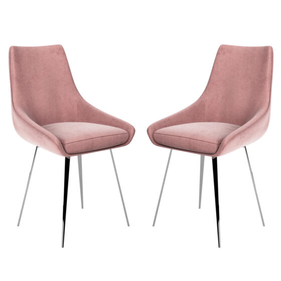 Add a luxurious statement to your dining area with the Furniture in Fashion Levant Pink Velvet Dining Chairs. Featuring plush velvet upholstery in an elegant Pink tone, these chairs bring sophistication and style to any modern or contemporary dining room. The rich colour palette and elegant silhouette make them a stunning focal point for your dining setup. Built for both comfort and durability, the Levant chairs include gently curved backs and cushioned seats for an enhanced dining experience. Supported by sleek chrome metal legs, these chairs offer long-lasting stability while maintaining a refined and minimalist look. Sold in a convenient set of two, theyre perfect for updating your dining space with a touch of glamour and comfort. FEATURES : Material : Velvet, Metal Finish : Pink, Chrome The Levant Dining Chair is a perfect blend of comfort and style for your dining space With a contoured backrest and a bounce-back cushioned seat pad, this chair provides a comfortable and sublime dining experience Crafted with soft touch velvet fabric and polished Stainless Steel legs Sumptuous Velvet, Contoured Back Rest Dense Bounce Back Cushioned Seat Pad Sublime Design, Polished Chrome Legs, Simple Assembly Upholstered in rich Pink velvet for a chic and luxurious aesthetic Padded seat and curved backrest provide superior comfort and support Crafted by Furniture in Fashion, a trusted UK brand known for quality and styles Available at an affordable price Images shown are for illustration purpose only DIMENSIONS : Height: 90cm Width: 52m Depth: 63cm