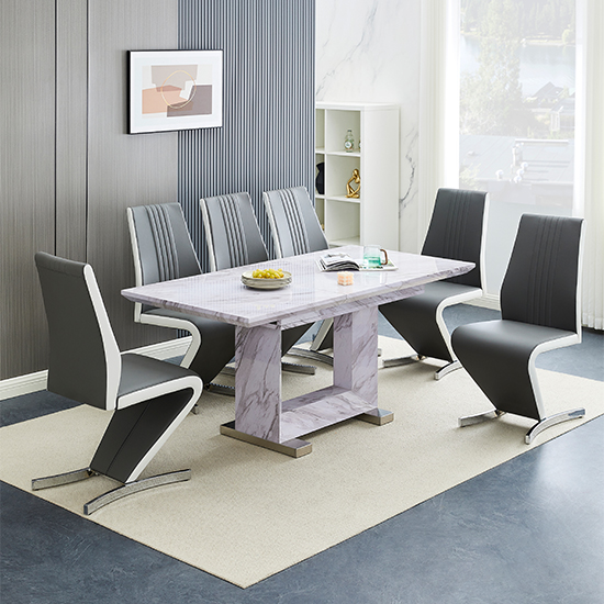 Lorence Extending Grey Dining Table 6 Gia Grey White Chairs