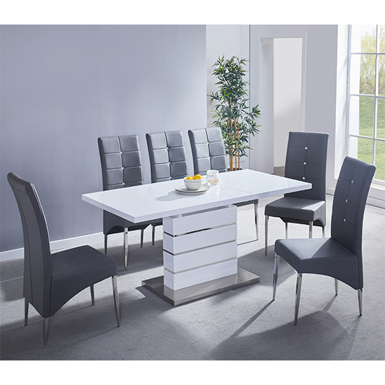 Parini Small Extending White Dining Table 6 Vesta Grey Chairs