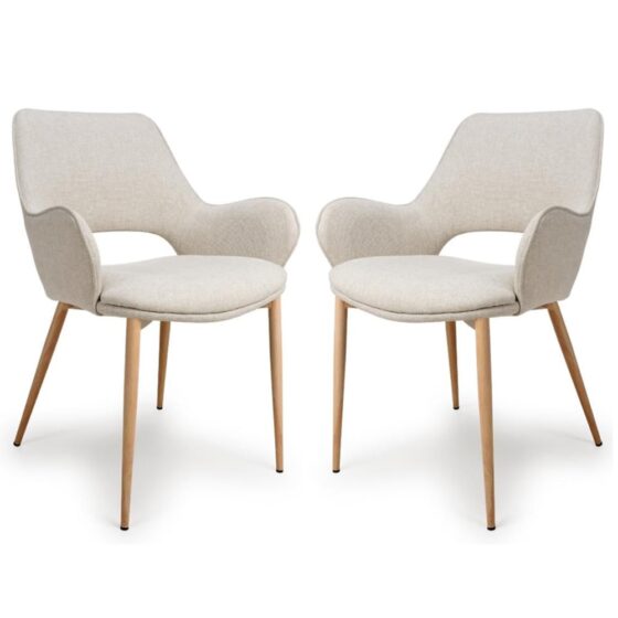 Bring timeless charm and contemporary comfort to your dining space with the Furniture in Fashion Sanremo Natural Fabric Dining Chairs with Oak Legs in Pair. Upholstered in a rich Natural fabric, these chairs add a warm and inviting tone to your dining area. The soft fabric and supportive cushioning ensure a cosy dining experience while enhancing the overall look of your room with their modern yet classic design. The Sanremo Dining Chairs by Furniture in Fashion are crafted with strong oak-effect legs, offering both durability and natural beauty. Designed for everyday use, these chairs combine style and practicality, making them suitable for both casual meals and formal dinner settings. Sold as a pair, they are an excellent choice for those looking to blend comfort, quality, and elegance in their dining setup. The Furniture in Fashion Sanremo Natural Fabric Dining Chairs with Oak Legs in Pair are a perfect combination of comfort, durability, and elegant design, making them a stylish addition to any dining room. FEATURES : Material : Fabric, Metal Finish : Natural, Oak Easy Clean Fabric Metal legs with wood effect finish The Sanremo chair is a must for those with a keen eye for design and detail Cool sleek lines bring together comfort and strength Dressed beautifully with an Easy Clean fabric this chair is practical too Comfort is achieved through the gentle padding and strength comes from expert manufacturing including the metal legs made with a wood effect finish Design led furniture for todays living Available at an affordable price Images shown are for illustration purpose only DIMENSIONS : Height : 830mm Width : 565mm Depth : 595mm